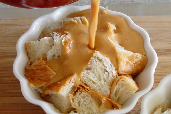 Προθερμαίνουμε τον φούρνο στους 180οC. Βάζουμε τα κομμάτια του τσουρεκιού σε πυρίμαχο σκεύος. Σε τηγάνι αναμειγνύουμε τη ζάχαρη και το νερό, ανακατεύοντας καλά με κουτάλι, και κατόπιν ζεσταίνουμε σε μέτρια προς δυνατή φωτιά. Αφήνουμε για 3-5 λεπτά, μέχρι η ζάχαρη να γίνει καραμέλα, χωρίς να ανακατέψουμε ή να ανακινήσουμε το τηγάνι. Αποσύρουμε από την φωτιά και προσθέτουμε σιγά σιγά την κρέμα γάλακτος. Συνεχίζουμε με το γάλα, ανακατεύουμε καλά και ταυτόχρονα ρίχνουμε τα χτυπημένα αυγά. Ανακατεύουμε μέχρι να ομογενοποιηθούν τα υλικά. Περιχύνουμε με τη σως το σκεύος με τα κρουασάν και αφήνουμε να μουλιάσει για 10 λεπτά. Ψήνουμε στον φούρνο για 30 λεπτά και απολαμβάνουμε.