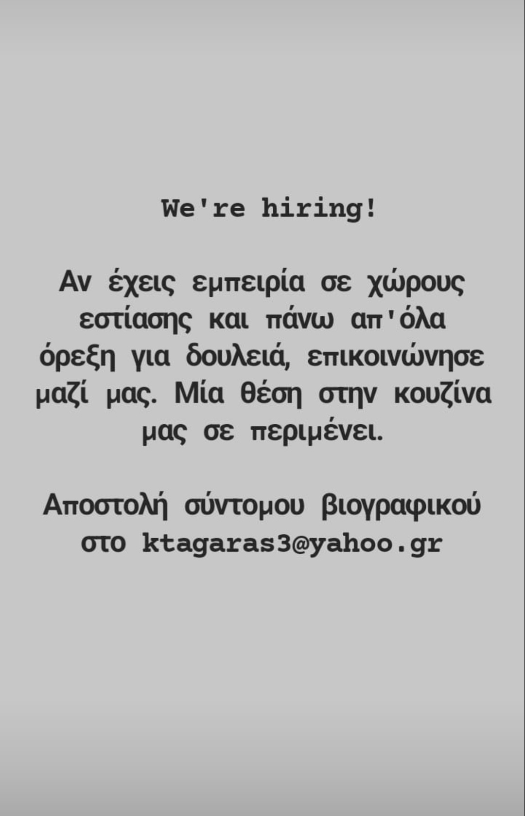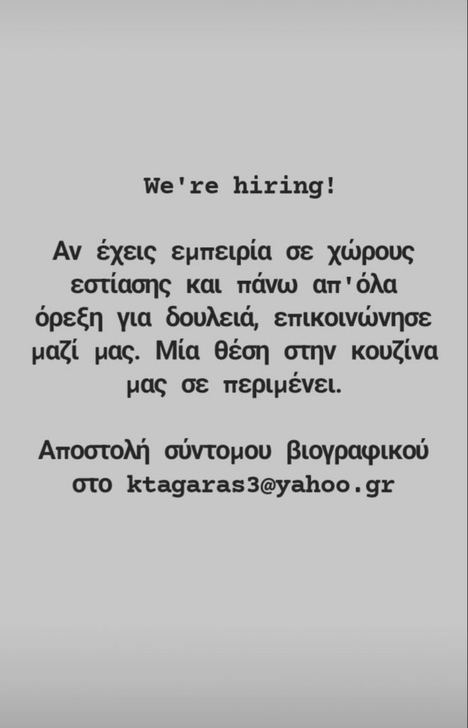 Κοζάνη 05/01/2023 Το μεζεδοπωλείο ‘Κουρούμπελο’ ζητά άτομα με εμπειρία για την κουζίνα 0 Το μεζεδοπωλείο ‘Κουρούμπελο’ ζητά άτομα με εμπειρία στον χώρο της εστίασης και πιο συγκεκριμένα στον χώρο της κουζίνας. Περισσότερες πληροφορίες και αποστολή βιογραφικού στο ktagaras3yahoo.gr .