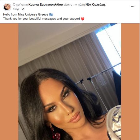 Η Κορίνα Εμμανουηλίδου, η όμορφη Κοζανίτισσα που κατέκτησε τον τίτλο MISS UNIVERSE GREECE , έχει αφιχθεί στη Νέα Ορλεάνη όπου βρέθηκε προκειμένου να διεκδικήσει τον τίτλο Μις Υφήλιος , στον κορυφαίο διαγωνισμό ομορφιάς, που θα διεξαχθεί στις 14 Ιανουαρίου .