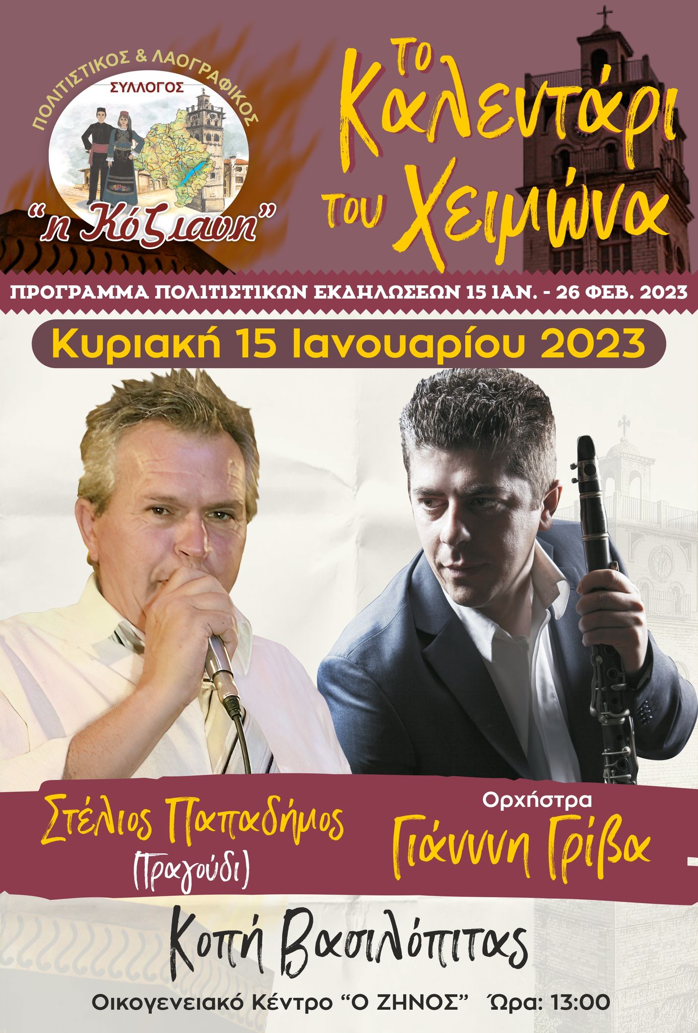 Την Κυριακή 15 Ιανουαρίου 2023 και ώρα 13.00 το μεσημέρι, ο Πολιτιστικός & Λαογραφικός Σύλλογος- Φανός «Η Κόζιανη» θα κόψει Βασιλόπιτα στο οικογενειακό κέντρο «Ο Ζήνος», στην Κοζάνη.