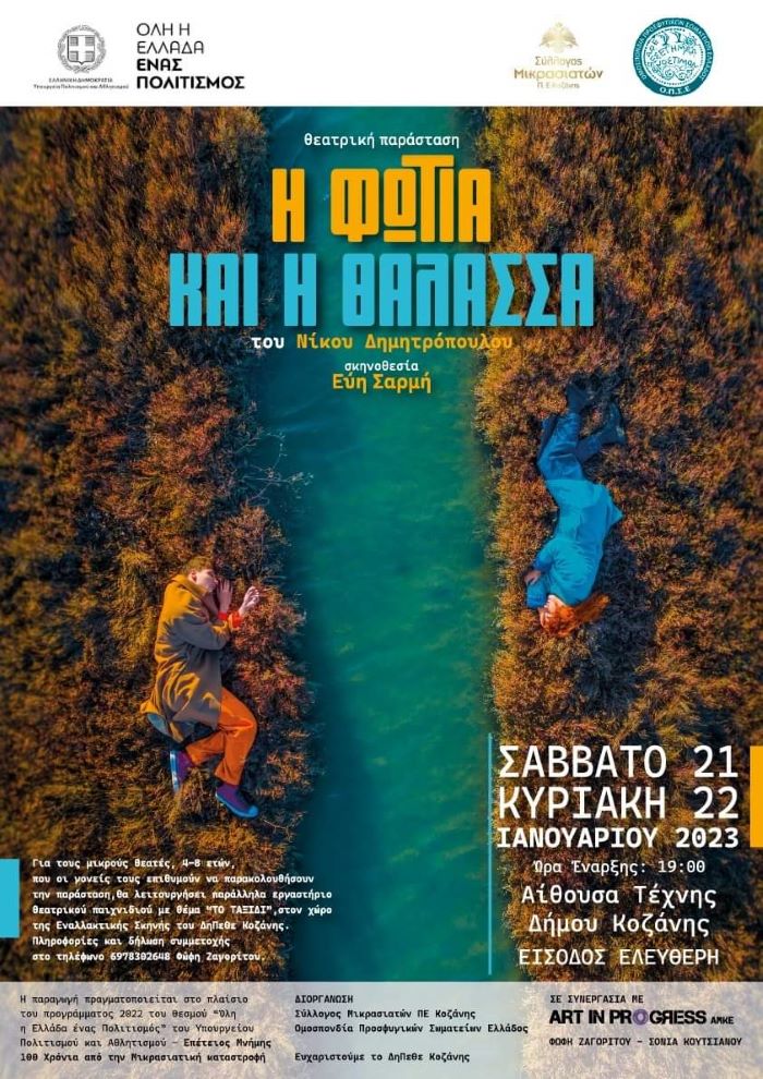 Ο Μικρασιατικός Σύλλογος ΠΕ Κοζάνης στο πλαίσιο των εκδηλώσεων μνήμης για τα 100 χρόνια από την Μικρασιατική καταστροφή και του Προγράμματος «Όλη η Ελλάδα ένας πολιτισμός» του ΥΠΠΟΑ σας προσκαλεί στην θεατρική παράσταση σκηνοθεσίας Εύης Σαρμή«Η ΦΩΤΙΑ ΚΑΙ Η ΘΑΛΑΣΣΑ» που θα πραγματοποιηθεί στην Αίθουσα Τέχνης του Δήμου Κοζάνης το Σάββατο 21 Ιανουαρίου & την Κυριακή 22 Ιανουαρίου 2023 στις 7:00 μμ