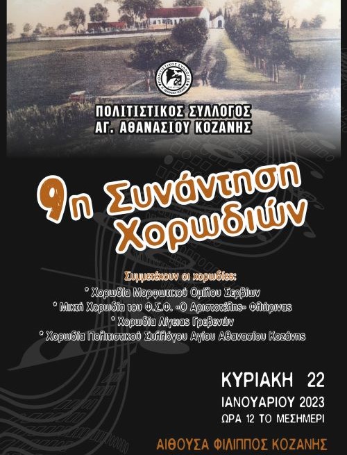 Την 9η Συνάντηση Χορωδιών διοργανώνει την Κυριακή 22 Ιανουαρίου 2023 στις 12.00 το μεσημέρι – προς τιμήν της εορτής του Αγίου Αθανασίου – στην Αίθουσα ¨ΦΙΛΙΠΠΟΣ¨ της Λ.Α.Φ. Κοζάνης, ο Πολιτιστικός Σύλλογος Αγ. Αθανασίου Κοζάνης.