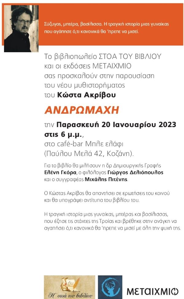 Το βιβλιοπωλείο η “Στοά του βιβλίου” και οι εκδόσεις Μεταίχμιο σας προσκαλούν στην παρουσίαση του νέου μυθιστορήματος του Κώστα Ακρίβου “Ανδρωμάχη” την Παρασκευή 20 Ιανουαρίου στις 6:00 μ.μ. στο cafe-bar Μπλέ Ελάφι (Παύλου Μελά 42).Για το βιβλίο θα μιλήσουν η δρ. Δημιουργικής Γραφής Ελένη Γκόρα, ο φιλόλογος Γιώργος Δελιόπουλος και ο συγγραφέας Μιχάλης Πιτένης.