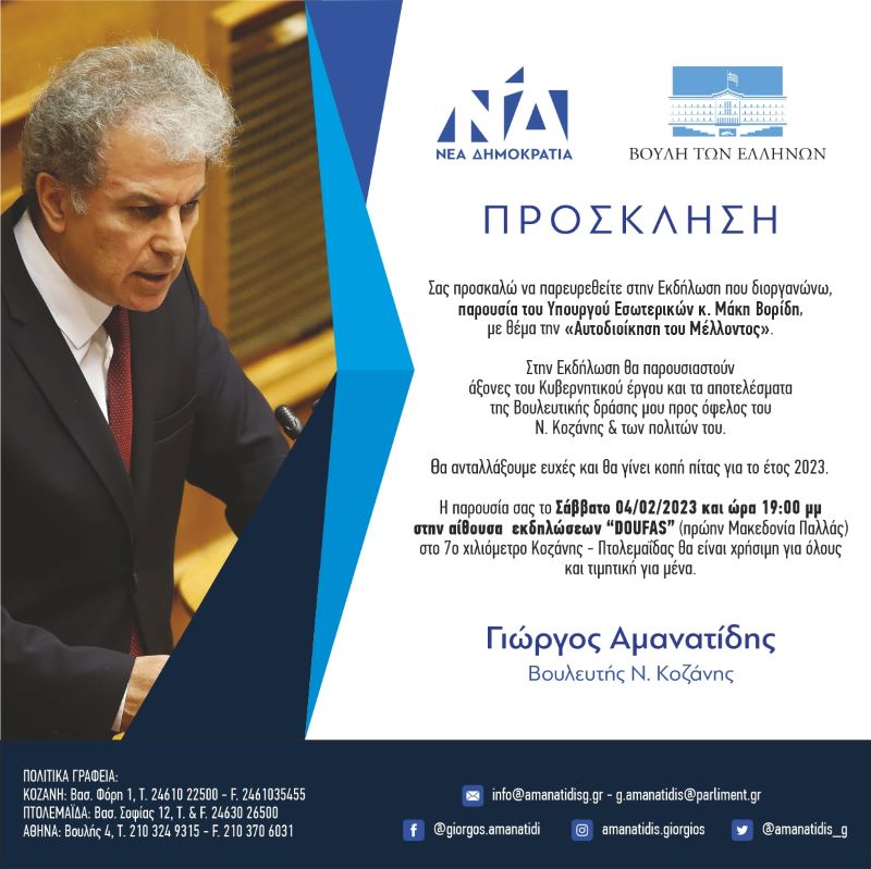 Το Σάββατο 4 Φεβρουαρίου 2023 στην αίθουσα εκδηλώσεων “DOUFAS”, παρουσία του Υπουργού Εσωτερικών κ. Μάκη Βορίδη, διοργανώνει εκδήλωση ο βουλευτής Ν Κοζάνης Γιώργος Αμανατίδης. Η εκδήλωση έχει τίτλο «Αυτοδιοίκηση του Μέλλοντος».