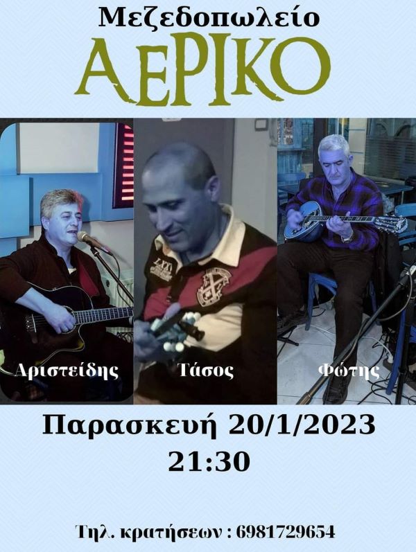 Οι Αριστείδης, Τάσος και Φώτης ενώνουν τις φωνές τους και τις μουσικές τους το βράδυ της Παρασκευής 20 Ιανουαρίου, στο μεζεδοπωλείο ‘ΑΕΡΙΚΟ’ , για ένα μοναδικό μουσικό ταξίδι σε τραγούδια αγαπημένα… Σας περιμένουμε στην ξεχωριστή μας στοά να ομορφύνουμε παρέα την βραδιά μας!