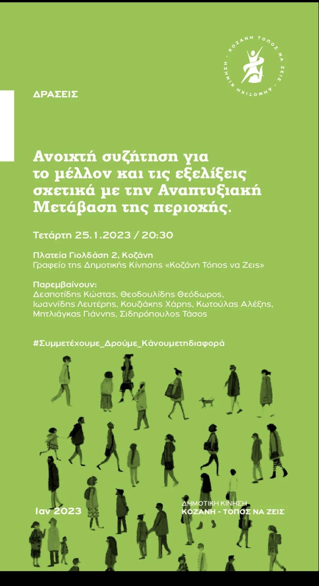 Την Τετάρτη 25/1/22 στο γραφείο της Κίνησης στην Πλατεία Γιολδάση και στα πλαίσια του προγραμματικού διαλόγου της Δημοτικής Κίνησης με την κοινωνία και τους φορείς του τόπου, οργανώνουμε ανοιχτή συζήτηση για το μέλλον και τις εξελίξεις σχετικά με την Αναπτυξιακή Μετάβαση της περιοχής.