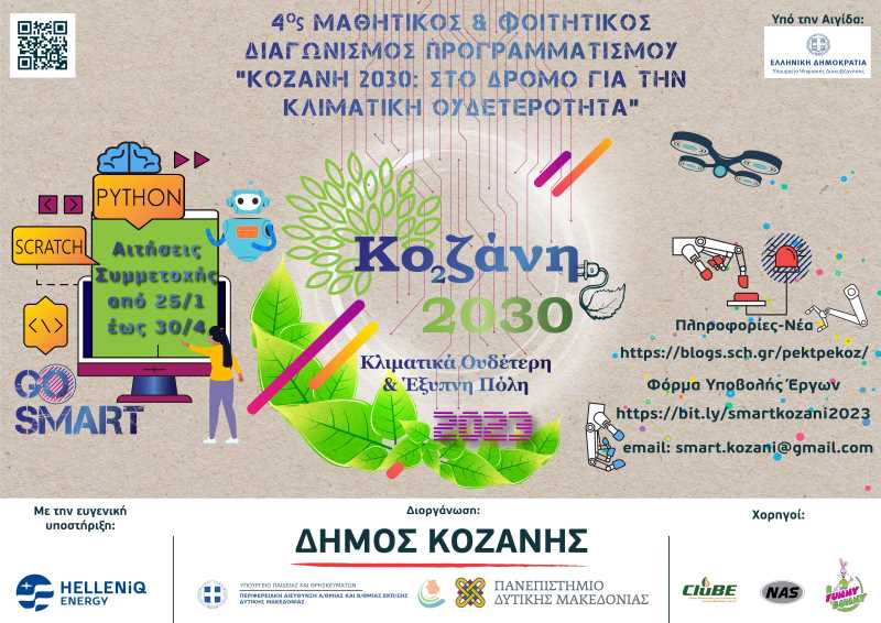 Η Περιφερειακή Διεύθυνση Εκπαίδευσης Δυτικής Μακεδονίας, ο Δήμος Κοζάνης και το Τμήμα Ηλεκτρολόγων Μηχανικών & Μηχανικών Υπολογιστών του Πανεπιστημίου Δυτικής Μακεδονίας διοργανώνουν τον Μαθητικό και Φοιτητικό Διαγωνισμό Προγραμματισμού με θέμα «Κοζάνη 2030: Στον δρόμο για την κλιματική ουδετερότητα», υπό την αιγίδα του Υπουργείου Ψηφιακής Διακυβέρνησης.