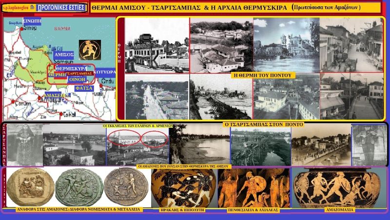 Πολύ κοντά στην αρχαία Αμισό (Σαμσούντα ) βρίσκεται μια μικρή κωμόπολη με το όνομα στην εποχή των Ελλήνων Θέρμη – Θέρμαι ( σήμερα Terme , εκεί κοντά βρισκόταν η Θερμυσκύρα που στην αρχαιότητα λένε ότι εκεί κατοικούσαν οι ξακουστές Αμαζόνες.Οι γυναίκες που πολεμούσαν πολύ καλλίτερα από τους άνδρες ,που ήταν ο φόβος και ο τρόμος για όσους στρατούς τους αντιμετώπιζαν ,που το όνομα τους φιγουράρει στην Ελληνική μυθολογία τόσο για την σχέση τους με ήρωες των Ελλήνων , όπως ο Ηρακλής, ο Θησέας, ο Αχιλλέας, ακόμα και ο Μέγας Αλέξανδρος, ήρθαν αντιμέτωποι σε διάφορες περιπτώσεις με το «θύλην γένος», συχνά σε άγριες και αιματηρές αντιπαραθέσεις.