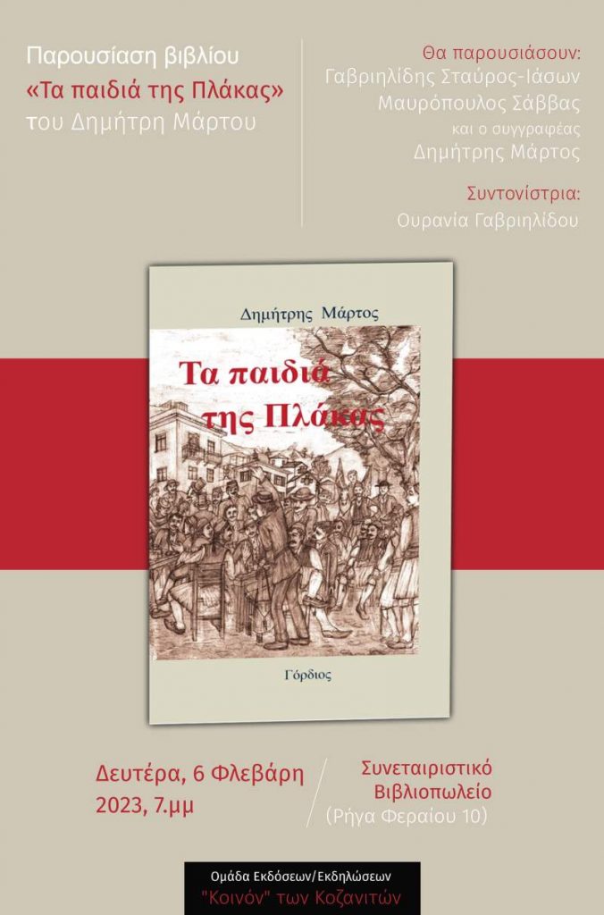 Την Δευτέρα  6 Φεβρουαρίου 2023 στις 7 το απόγευμα στο χώρο του Συνεταιριστικού Βιβλιοπωλείου θα γίνει παρουσίαση του βιβλίου του Δημήτρη Μάρτου «Τα παιδιά της Πλάκας». Την εκδήλωση συνδιοργανώνουν  το Συνεταιριστικό Βιβλιοπωλείο και η ομάδα εκδόσεων και εκδηλώσεων του Συλλόγου «Κοινόν των Κοζανιτών». Η παρουσίαση του βιβλίου θα γίνει από τον Σταύρο Γαβριηλίδη, τον Σάββα Μαυρόπουλο και τον συγγραφέα Δημήτρη Μάρτο. Την παρουσίαση – συζήτηση θα συντονίσει η Ουρανία Γαβριηλίδου.