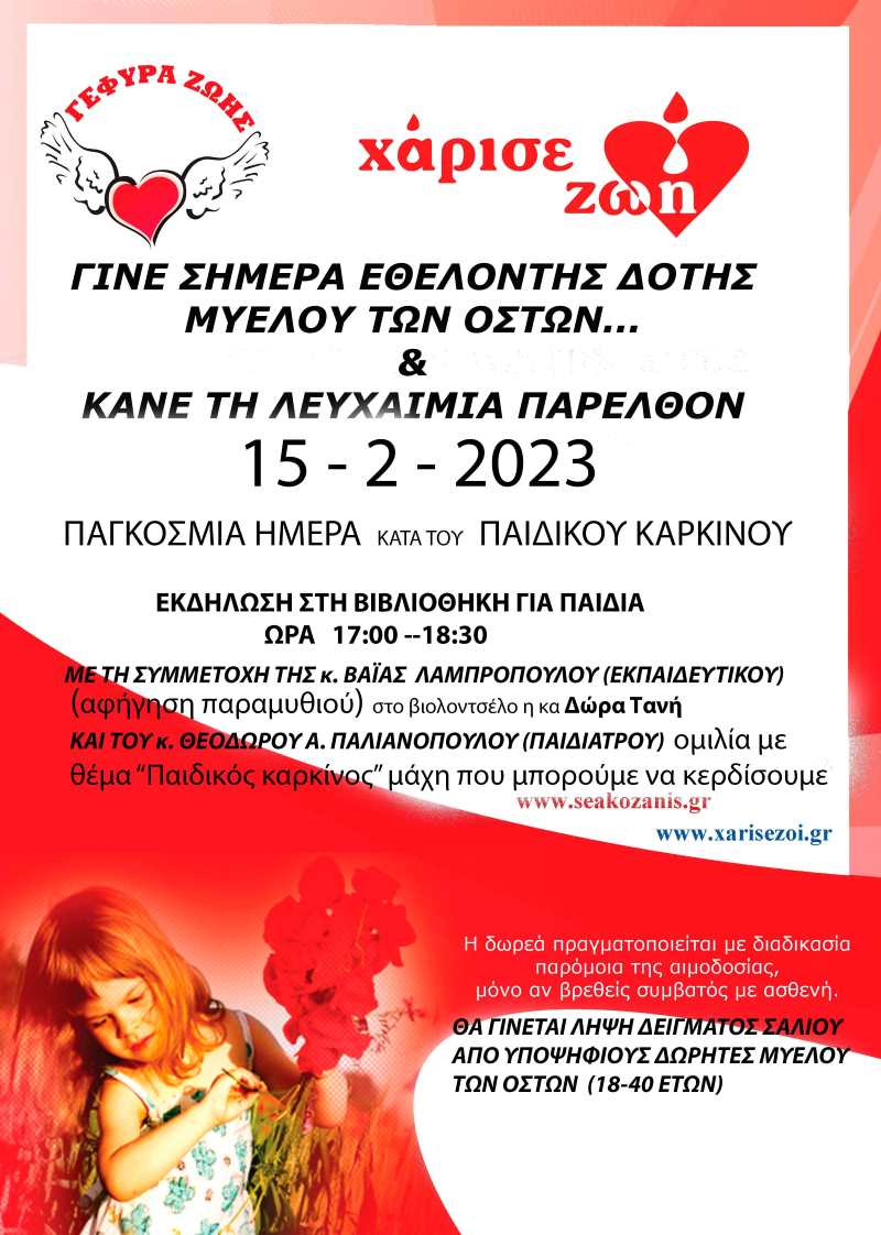 Από τις 17:00 προσέλευση και λήψη δείγματος σάλιου για εγγραφή στον παγκόσμιο ιστό δωρητών μυελού των οστών. Στη συνέχεια στις 17:30 ομιλία του Παιδίατρου κ. Θεόδωρου Α. Παλιανόπουλου με θέμα «Παιδικός καρκίνος» η μάχη που μπορούμε να κερδίσουμε…