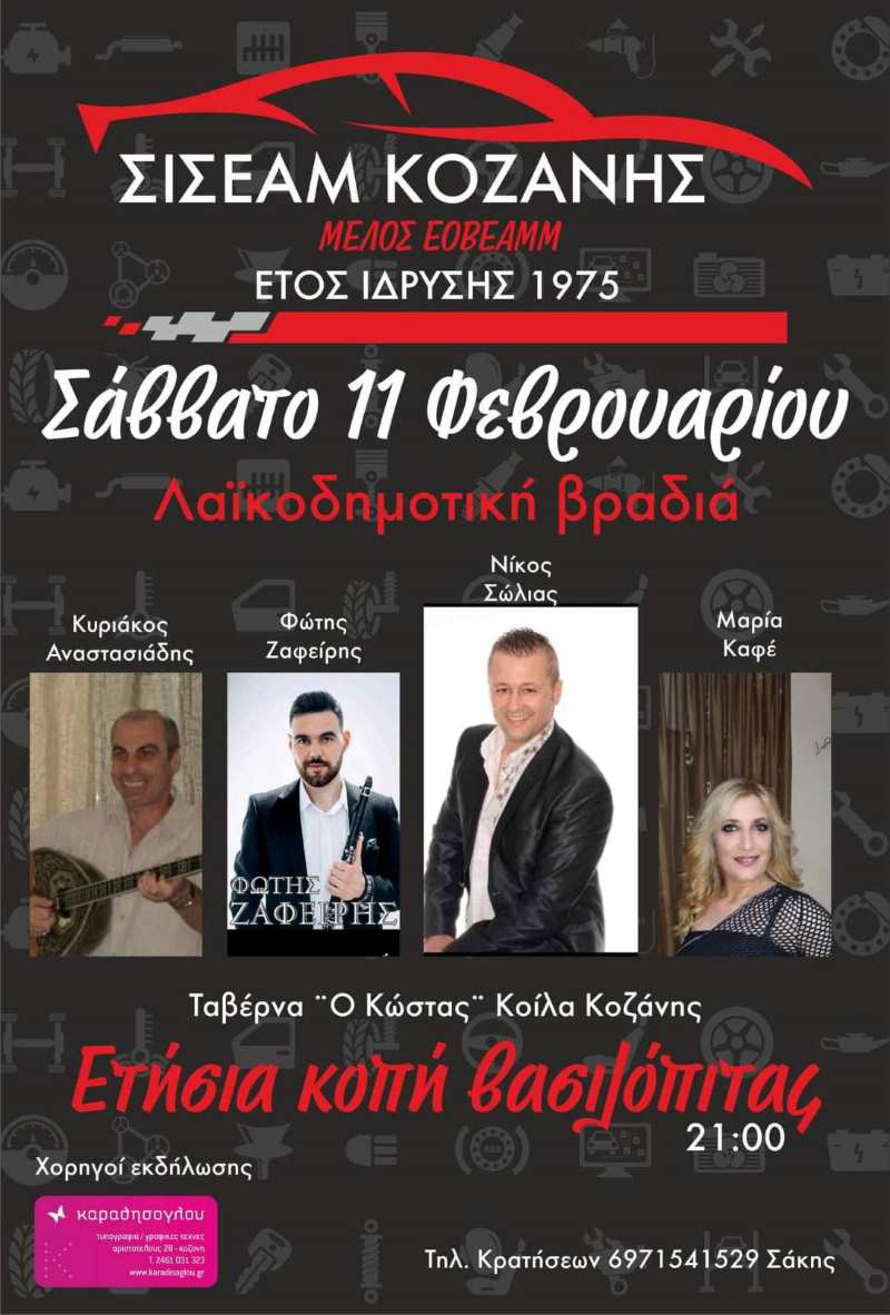Ο Σύλλογος Ιδιοκτήτων Συνεργείων Επισκευής Μηχανών Αυτοκίνητων σας προσκαλεί στην κοπή πίτας και τον ετήσιος χορός που θα πραγματοποιηθεί στην ταβέρνα ‘Ο Κώστας’, στα Κοίλα Κοζάνης, το Σάββατο 11 Φεβρουαρίου 2023 με λαϊκο-δημοτική βραδιά. Με ώρα έναρξης στις 21:00.