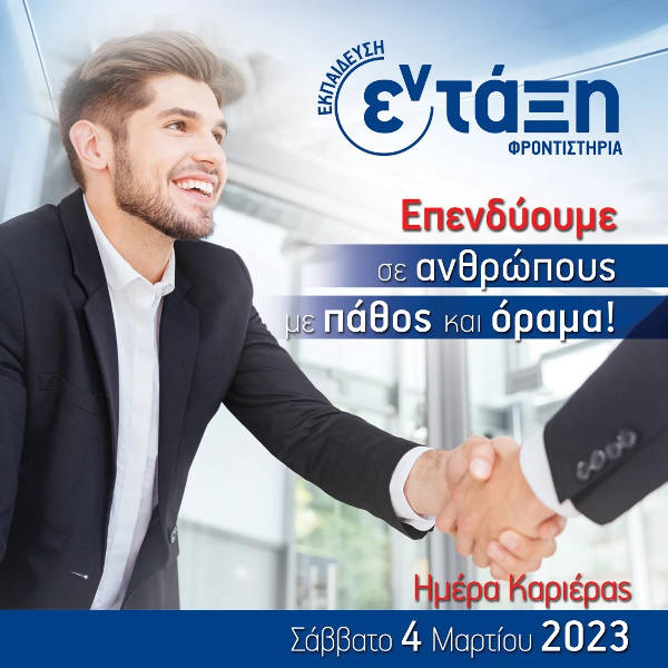 Αν είσαι καθηγητής είτε μέσης εκπαίδευσης είτε ξένης γλώσσας και επιθυμείς να συνεργαστείς μαζί μας, με εξαιρετικές προοπτικές εξέλιξης, τότε δήλωσε συμμετοχή στην «Ημέρα Καριέρας», που διοργανώνουμε το Σάββατο 4 Μαρτίου 2023 στα Κεντρικά γραφεία του ομίλου μας στο Χαϊδάρι, Αϊδινίου 26 και Καραϊσκάκη (Παλατάκι), ΤΚ 124 61.