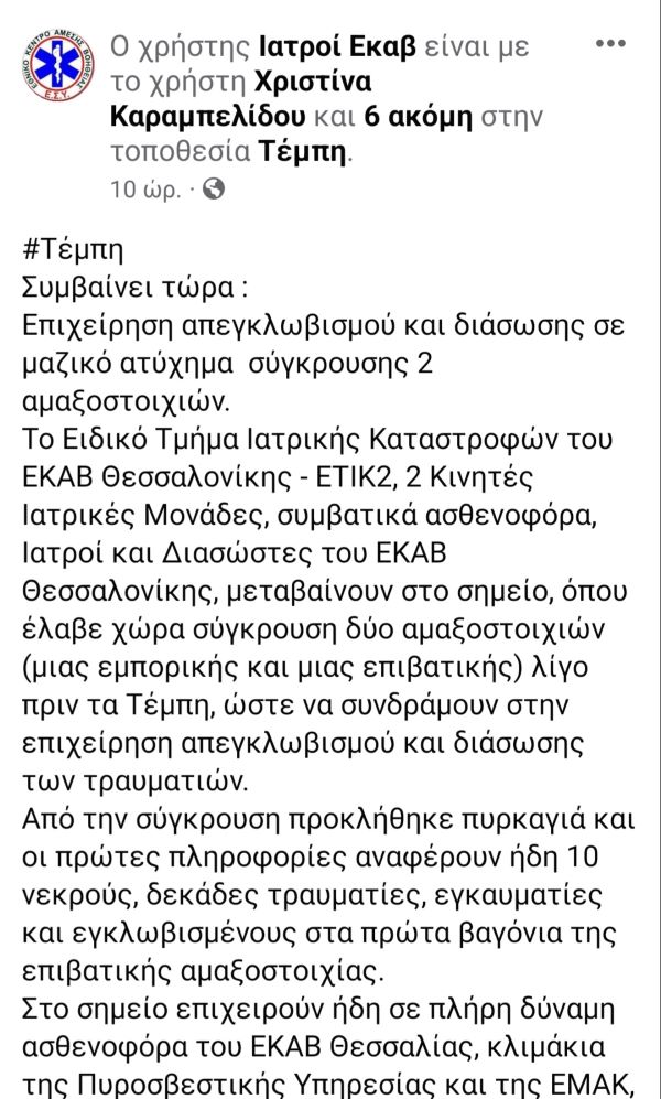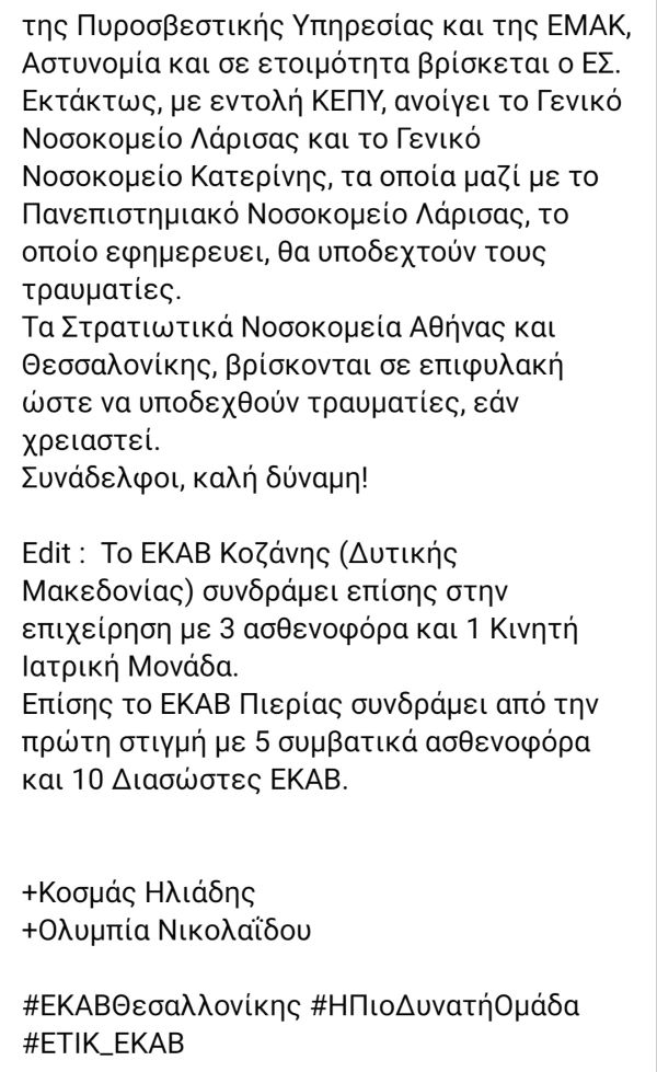 Από το ΕΚΑΒ Κοζάνης (δυτικής Μακεδονίας) έφυγαν από την πρώτη στιγμή της τραγωδίας , 3 ασθενοφόρα και η κινητή μονάδα με γιατρό ώστε να συνδράμουν στο τραγικό συμβάν. Σε επιφυλακή όλη η δύναμη του ΕΚΑΒ.