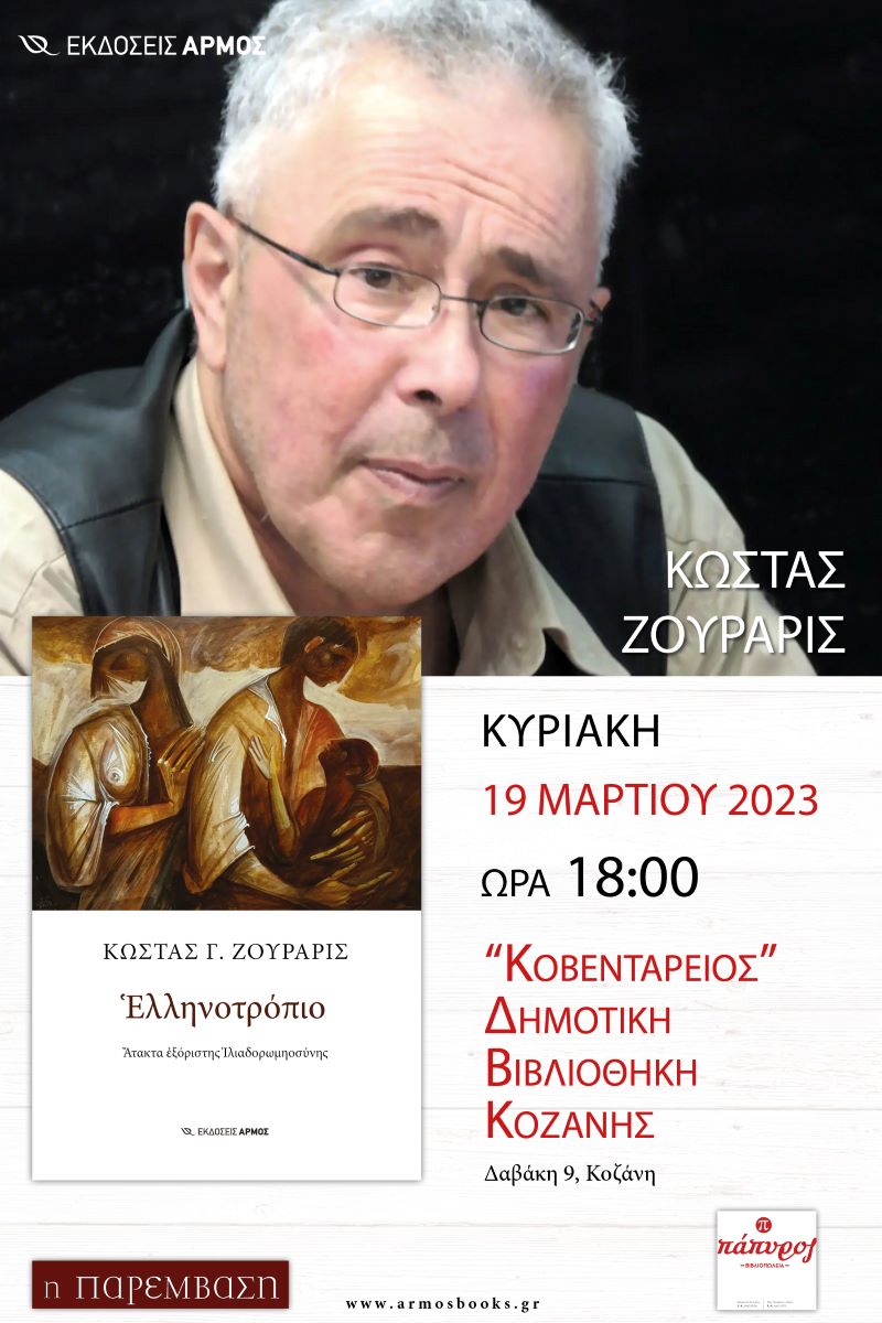 Το βιβλίο του Κώστα Γ. Ζουράρι «Ελληνοτρόπιο, Άτακτα εξόριστης Ιλιαδορωμηοσύνης», πρόκειται να παρουσιαστεί την Κυριακή 19 Μαρτίου 2023, ώρα 6 μ. μ., στην Κοβεντάρειο Δημοτική Βιβλιοθήκη Κοζάνης. Για το βιβλίο θα μιλήσουν οι: Καλλιόπη Βέτα, Βουλευτής Σύριζα Π.Ε. Κοζάνης – Ερμηνεύτρια, Ολυμπία Τσικαρδάνη, Φιλόλογος – Ποιήτρια, Γιώργος Χατζηπαντελής, Αρχιτέκτων – MSc Φιλοσοφίας και ο συγγραφέας. Την εκδήλωση συντονίζει η Δήμητρα Καραγιάννη, Φιλόλογος – Συγγραφέας.