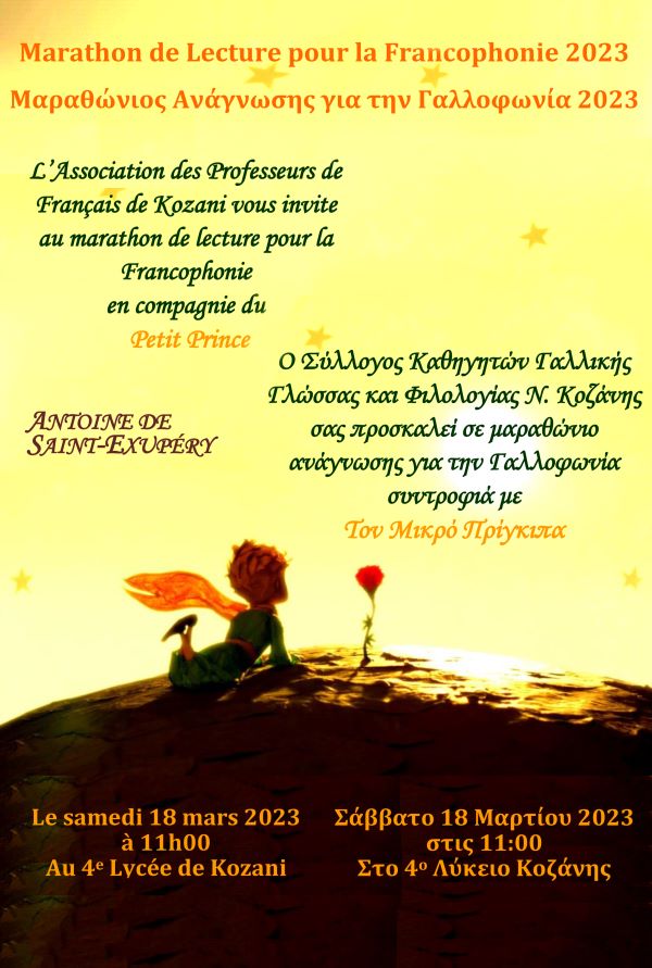 Ο Σύλλογος Εκπαιδευτικών Γαλλικής Γλώσσας Ν. Κοζάνης, έχοντας την ευθύνη διάχυσης των αξιών του Διεθνούς Οργανισμού Γαλλοφωνίας, προσκαλεί μαθητές και μαθήτριες όλων των βαθμίδων του νομού μας σε Μαραθώνιο Ανάγνωσης για τη Γαλλοφωνία με θέμα: Ο Μικρός Πρίγκιπας, του Αντουάν ντε Σαιντ Εξυπερύ.