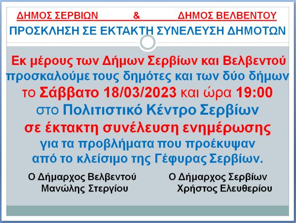 Εκ μέρους των Δήμων Βελβεντού και Σερβίων προσκαλούμε τους δημότες και των δύο δήμων το Σάββατο 18/03/2023 και ώρα 19:00 στο Πολιτιστικό Κέντρο Σερβίων σε έκτακτη συνέλευση ενημέρωσης για τα προβλήματα που προέκυψαν από το κλείσιμο της Γέφυρας Σερβίων.