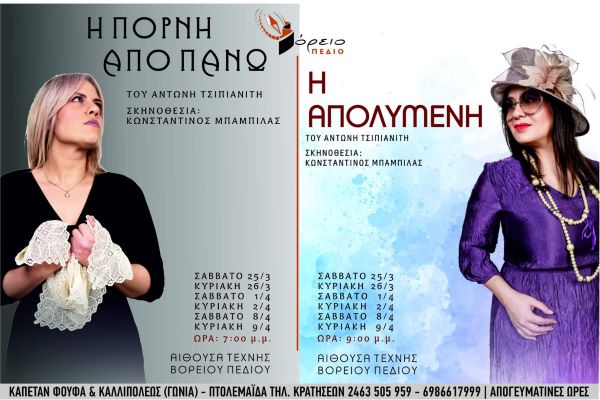 Η ΠΡΕΜΙΕΡΑ των δύο έργων είναι το ΣΑΒΒΑΤΟ 25 ΜΑΡΤΙΟΥ. Στις 7 μ.μ.θα παιχθεί Η ΠΟΡΝΗ ΑΠΟ ΠΑΝΩ και στις 9 μ.μ. θα παιχθεί Η ΑΠΟΛΥΜΕΝΗ.