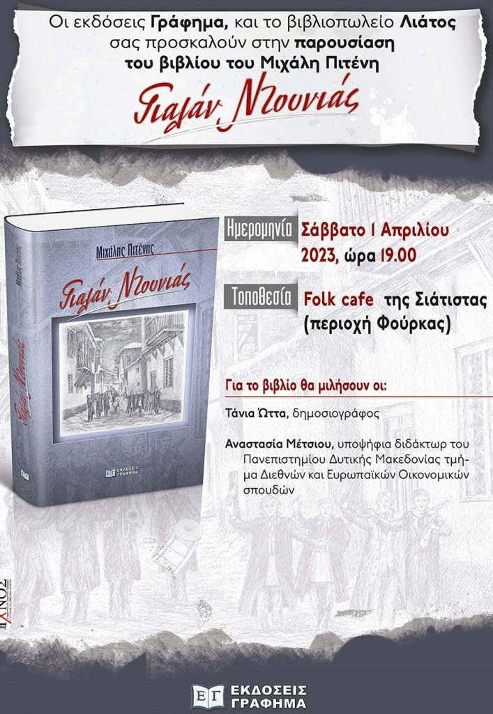 Οι εκδόσεις ΓΡΑΦΗΜΑ και το βιβλιοπωλείο Λιάτος παρουσιάζουν το Σάββατο 1 Απριλίου 2023 το νέο μυθιστόρημα του Μιχάλη Πιτένη, «Γιαλάν Ντουνιάς», στις 19.00 στο Folk cafe της Σιάτιστας (περιοχή Φούρκας).