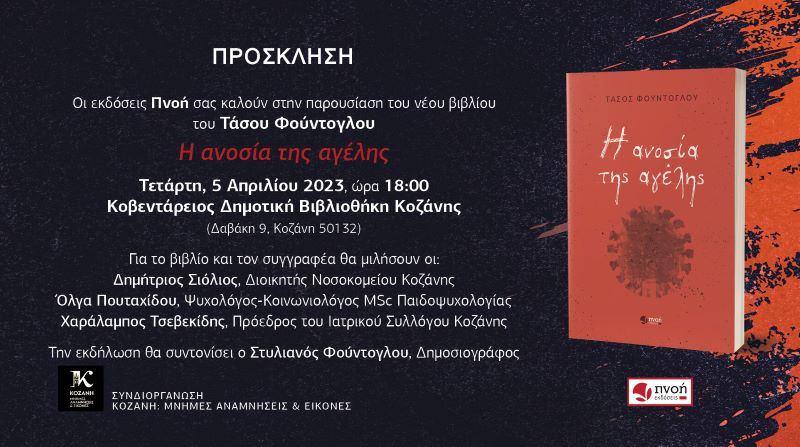 Την Τετάρτη, 5 Απριλίου 2023, ώρα 18:00 στην Κοβεντάρειο Δημοτική Βιβλιοθήκη Κοζάνης (Δαβάκη 9, Κοζάνη 50132) θα γίνει η επίσημη πρώτη παρουσίαση του νέου μυθιστορήματος του συντοπίτη μας ιατρού Τάσου Φούντογλου με τίτλο «Η ανοσία της αγέλης» από τις εκδόσεις Πνοή.
