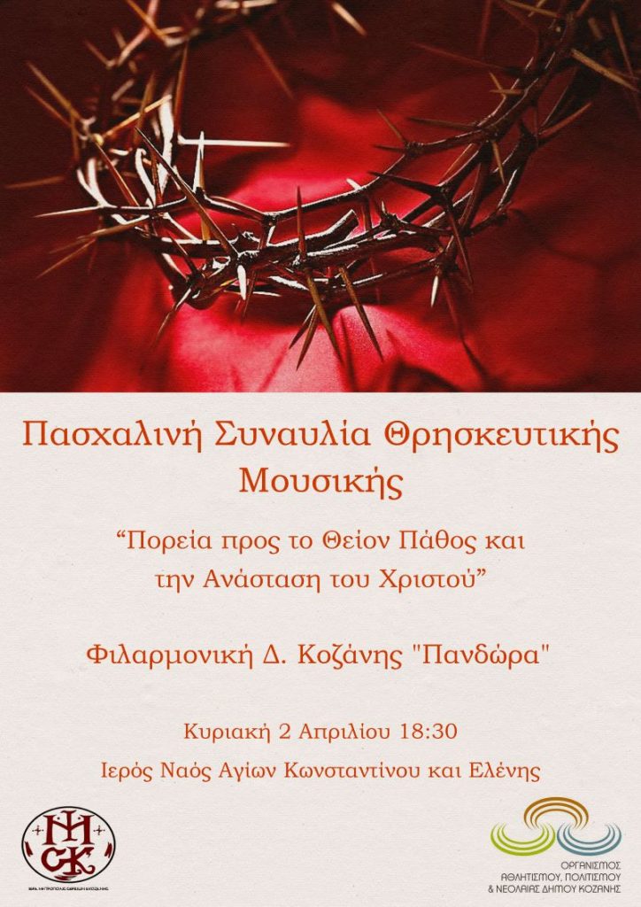 Ο Οργανισμός Αθλητισμού, Πολιτισμού και Νεολαίας του Δήμου Κοζάνης και η Ιερά Μητρόπολη Σερβίων και Κοζάνης διοργανώνουν την Κυριακή 2 Απριλίου 2023 στις 18:30 στον Ιερό Ναό των Αγίων Κωνσταντίνου και Ελένης Πασχαλινή Συναυλία Θρησκευτικής Μουσικής με την Φιλαρμονική του Δήμου Κοζάνης «Πανδώρα» και τίτλο «Πορεία προς το Θείον Πάθος και την Ανάσταση του Χριστού». Ένα μουσικοαφηγηματικό οδοιπορικό στη Μεγάλη Εβδομάδα σε Μουσική Διεύθυνση Νίκου Χρυσοχόου και Αφήγηση – Απαγγελία Παναγιώτη Μπετσάκου.
