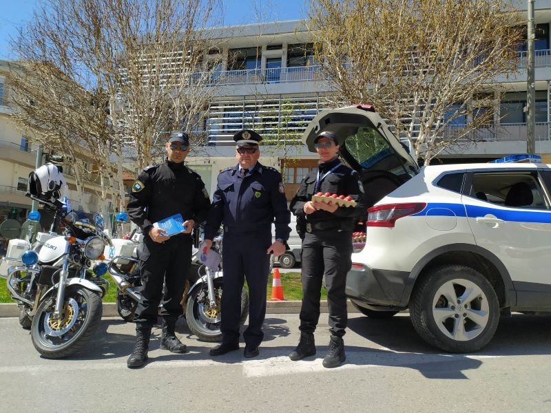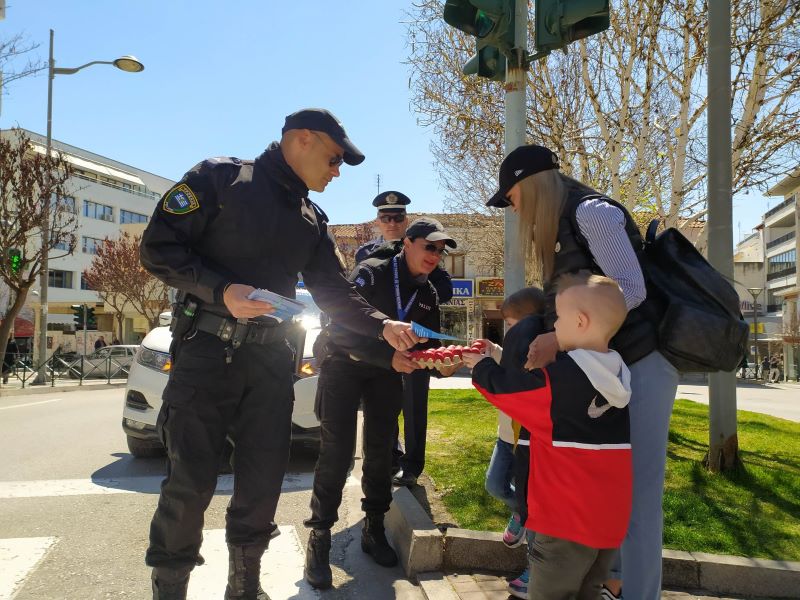 Πασχαλινά αυγά και ευχές έδωσαν ο Διοικητής και το προσωπικό του Τμήματος Τροχαίας Κοζάνης σε διερχόμενους πεζούς και οδηγούς οχημάτων, το πρωί της Μεγάλης Πέμπτης 13 Απριλίου 2023, σε κεντρικούς δρόμους της πόλης.
