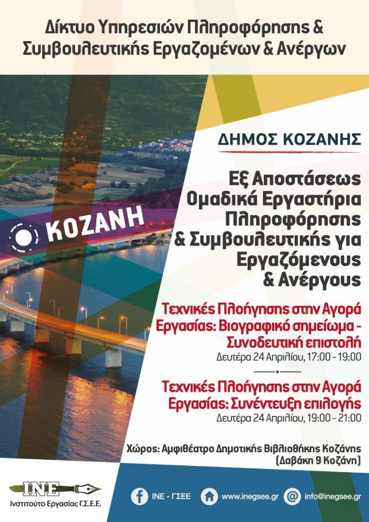 Το Περιφερειακό ΙΝ.Ε.-Γ.Σ.Ε.Ε. Δυτικής Μακεδονίας (Κοζάνη), ανακοινώνει την υλοποίηση ομαδικών εργαστηρίων συμβουλευτικής/πληροφόρησης για ανέργους και  εργαζομένους.