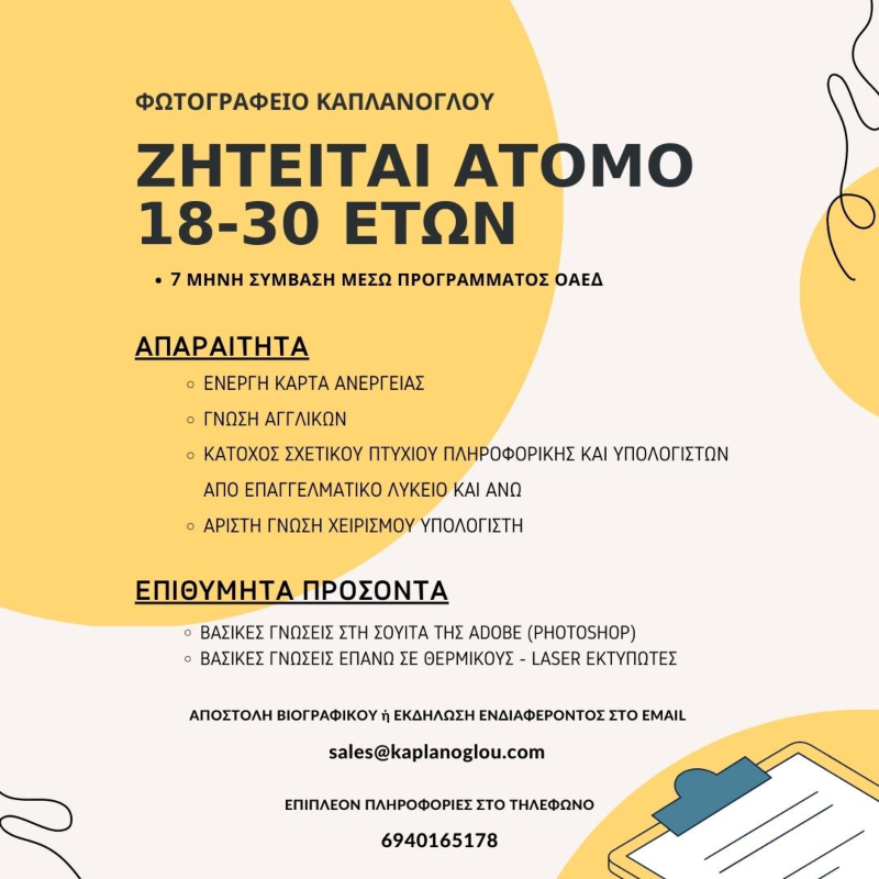 Ζητείται άτομο 18-30 ετών για 7 μηνη σύμβαση μέσω προγράμματος ΟΑΕΔ από το Φωτογραφείο Καπλάνογλου στην Κοζάνη .