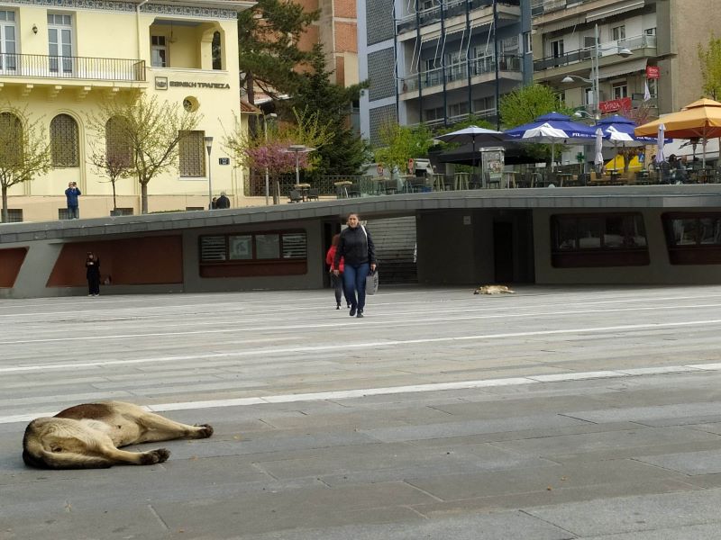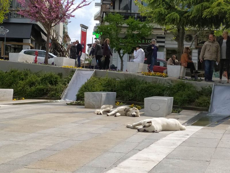 Αδέσποτα σκυλιά απολαμβάνουν τις ακτίνες του ήλιου σε ένα χαλαρό mood το πρωί του Σαββάτου 23 Απριλίου 2023 στην κεντρική πλατεία της πόλης. Πολίτες που απολαμβάνουν τον καφέ τους και περαστικοί από την πλατεία χαζεύουν τη στιγμή.