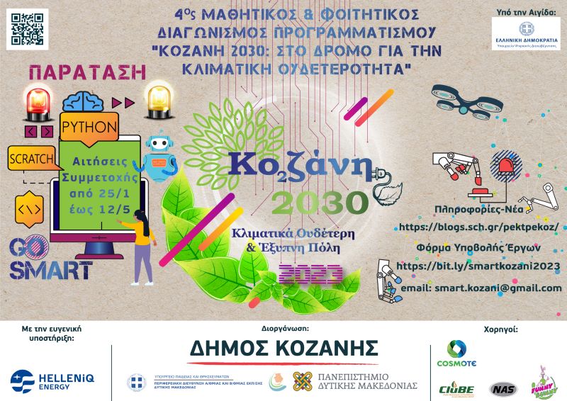 Μέχρι τις 12 Μαΐου 2023 παρατείνεται η υποβολή παραδοτέων για τους συμμετέχοντες στον φετινό Μαθητικό & Φοιτητικό Διαγωνισμό Προγραμματισμού «Κοζάνη 2030: Στο δρόμο για την κλιματική ουδετερότητα».