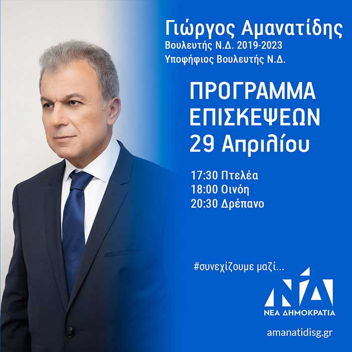 Πολιτικά 28/04/2023 Πρόγραμμα επισκέψεων του υποψήφιου Βουλευτή ΝΔ Ν. Κοζάνης Γιώργου Αμανατίδη το Σάββατο 29 Απριλίου 0