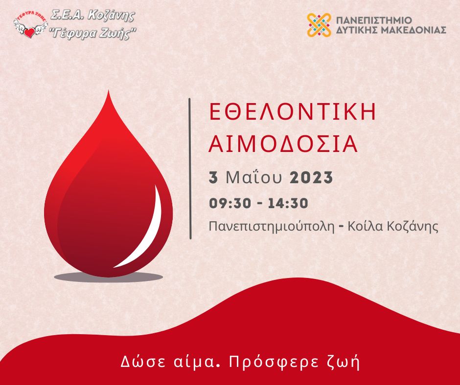 Ο Σύλλογος Εθελοντών Αιμοδοτών Κοζάνης “Γέφυρα Ζωής” σε συνεργασία με το “Μαμάτσειο” Γ.Ν. Κοζάνης και την υποστήριξη της Φοιτητικής Ομάδας Εθελοντικής Αιμοδοσίας (Π.Ε. Κοζάνης) του Πανεπιστημίου Δυτικής Μακεδονίας, διοργανώνουν εθελοντική αιμοδοσία.