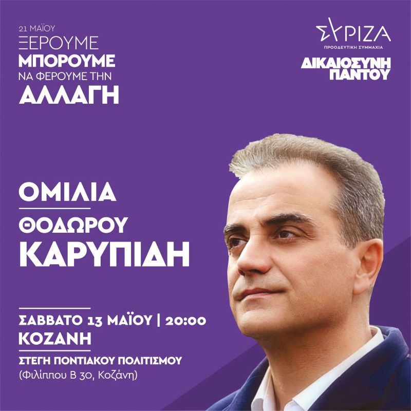 Το Σάββατο στις 13 Μαΐου 2023 και ώρα 20:00, η πολιτική ομιλία του υποψήφιου Βουλευτή ΣΥΡΙΖΑ Π.Σ. Κοζάνης Θεόδωρου Καρυπίδη στην Στέγη Ποντιακού Πολιτισμού στην Κοζάνη.