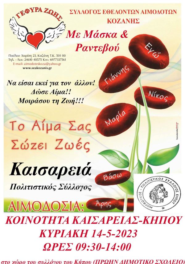 Αιμοδοσία την Κυριακή 14 Μαΐου 2023 και ώρα 09:30 -14:00 στο Πνευματικό Κέντρο (πρώην Δημοτικό Σχολείο) του Τ.Δ. Κήπου, σε συνεργασία με το Μορφωτικό –Πολιτιστικό Σύλλογο Κήπου, τον Πολιτιστικό Σύλλογο Καισαρειάς & την Αιμοδοσία του Γ.Ν. Κοζάνης.