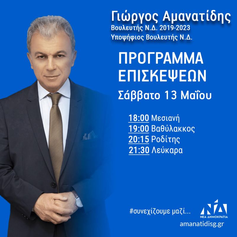 Πολιτικά 13/05/2023 Το πρόγραμμα επισκέψεων του υποψήφιου Βουλευτή ΝΔ Γιώργου Αμανατίδη για τo Σάββατο 13 Μαΐου 0 Το πρόγραμμα επισκέψεων του υποψήφιου Βουλευτή ΝΔ Γιώργου Αμανατίδη για τo Σάββατο 13 Μαΐου 2023.