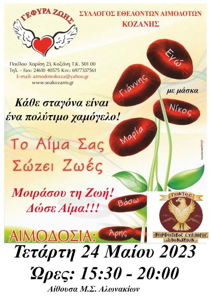 Την Τετάρτη 24 Μαΐου και ώρα 15:30-20:00 στην Αίθουσα του Μορφωτικού Συλλόγου Αλωνακίων ¨ Πόντος¨ Αιμοδοσία του Σ. Ε. Αιμοδοτών Κοζάνης «ΓΕΦΥΡΑ ΖΩΗΣ» σε συνεργασία με τον Μορφωτικό Σύλλογο Αλωνακίων ¨Πόντος¨ και το τμήμα Αιμοδοσίας του Μαμάτσειου Γενικού Νοσοκομείου Κοζάνης.