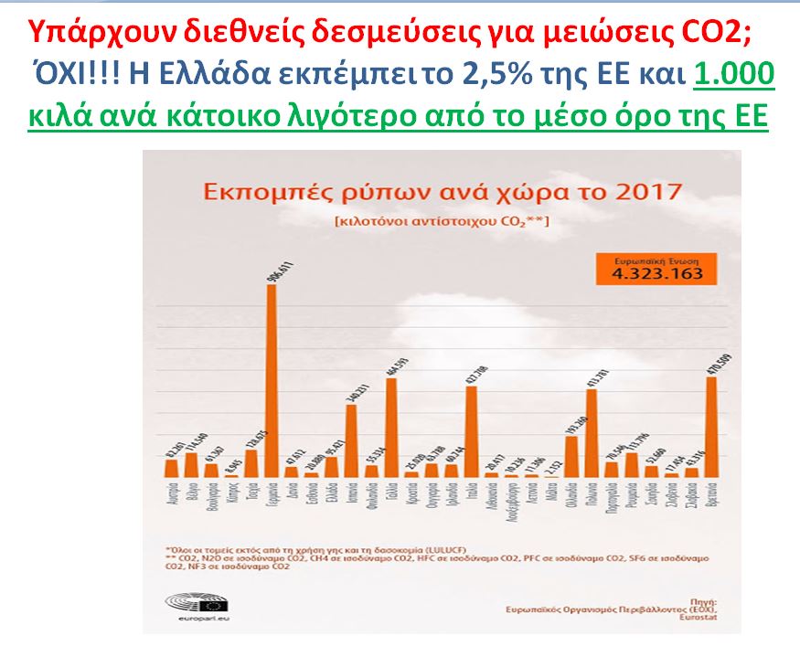- «Χωρίς τα αιολικά δεν πιάνουμε τον ευρωπαϊκό στόχο μείωσης του CO2» Ποια είναι η αλήθεια; Η Χώρα μας παρότι συμβάλλει μόνο 2,5% στις συνολικές εκπομπές των χωρών της ΕΕ έχει ήδη υπερκαλύψει όλες της τις υποχρεώσεις αφού εκπέμπει 1.000 κιλά λιγότερα από τον μέσο όρο των χωρών της ΕΕ ετησίως ανά άτομο. Επιπλέον το δ` τρίμηνο του 2022 μείωσε κατά 6,4% τις εκπομπές διοξειδίου έναντι 4% που ήταν ο μέσος όρος των χωρών της ΕΕ. Μήπως μείωσε τις εκπομπές επειδή έχουμε πολλές ΑΠΕ (7η χώρα στον κόσμο σε ανάπτυξη ΑΠΕ); Κάθε άλλο! Η Χώρα μας μείωσε τις εκπομπές διοξειδίου λόγω φτώχειας των κατοίκων της γενικότερα και ενεργειακής φτώχειας ειδικότερα αλλά και λόγω αποβιομηχάνισης. Συγκεκριμένα από το 2011 έως σήμερα η κατανάλωση ρεύματος στην Ελλάδα μειώθηκε πάνω από 50%! Να τελειώνει και αυτό το παραμύθι. Αυτοί που πρέπει να μειώσουν εκπομπές διοξειδίου στην ΕΕ είναι η Γερμανία, η Πολωνία η Τσεχία, η Σλοβακία κ.α που εκπέμπουν τη μερίδα του λέοντος και φιγουράρουν μέσα στις πρώτες χώρες του κόσμου. Αυτοί όχι μόνο δεν μειώνουν αλλά εγκαινιάζουν αβέρτα καινούργιες λιγνιτικές και ανθρακικές μονάδες σε αντίθεση με την «πάμπλουτη» Ελλάδα που κλείνει τον λιγνίτη με εντολή των ΗΠΑ για να αγοράζει το δικό τους πανάκριβο LNG που εκτός των άλλων παράγεται με την καταστροφική μέθοδο Fracking
