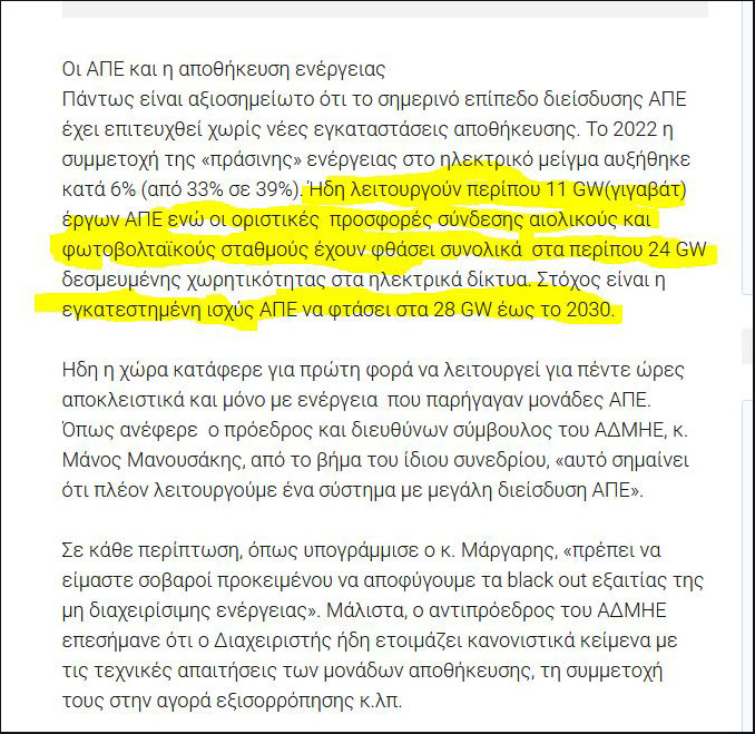 Εικόνα 3. Ο για 3η φορά αναθεωρημένος ΕΣΕΚ προβλέπει το 2030 να έχουμε εγκαταστήσει 28 γιγαβατ ΑΠΕ αλλά σήμερα, Μάης το 2023, έχουμε εγκατεστημένα 35 γιγαβατ!!!! Γιατί συνεχίζουν και εντείνουν την καταστροφή με νέες ΑΠΕ;