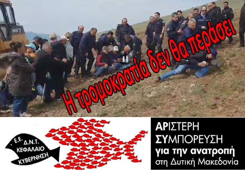 Αυτή είναι η Ελληνική αστυνομία! 100 και πλέον αστυνομικοί καλούνται από μια ιδιωτική εταιρεία για να προστατέψουν τα συμφέροντά της που όμως είναι σε βάρος των συμφερόντων των κατοίκων, του πρωτογενούς τομέα και του περιβάλλοντος. Αυτό είναι το Ελληνικό Κράτος και οι αστικές κυβερνήσεις υπηρέτες του Κεφαλαίου και των «πράσινων» κατακτητών. Πολιτική που την υπηρέτησαν πιστά όλες οι Κυβερνήσεις (ΝΔ-ΠΑΣΟΚ-ΣΥΡΙΖΑ και τα παρακλάδια τους)