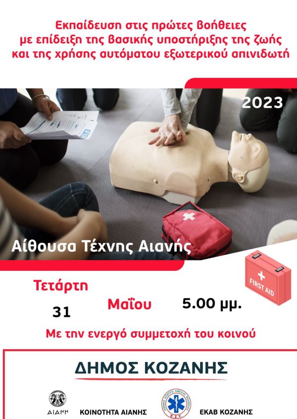 Ο Δήμος Κοζάνης και η Κοινότητα Αιανής σε συνεργασία με το ΕΚΑΒ Κοζάνης διοργανώνουν Εκπαίδευση στις Πρώτες Βοήθειες με επίδειξη της βασικής υποστήριξης της ζωής και της χρήσης αυτομάτου εξωτερικού απινιδωτή. Η δράση θα πραγματοποιηθεί την Τέταρτη 31 Μαΐου 2023, στις 5 το απόγευμα, στην Αίθουσα Τέχνης Αιανής.