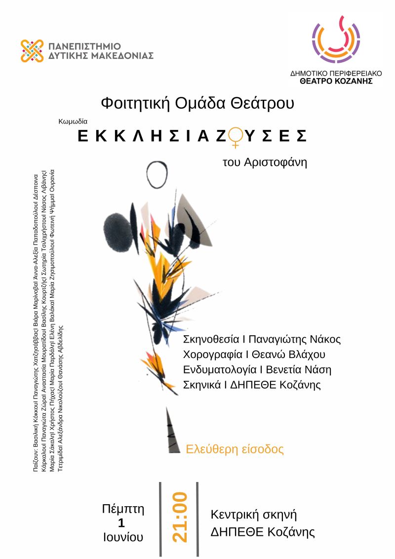 Η φοιτητική θεατρική ομάδα του Πανεπιστημίου Δυτικής Μακεδονίας «ΑμφιΘέατρο»  παρουσιάζει την κωμωδία του Αριστοφάνη «Εκκλησιάζουσες», την Πέμπτη 01 Ιουνίου 2023, στις 21:00, στην κεντρική σκηνή του ΔΗ.ΠΕ.ΘΕ. Κοζάνης (Αίθουσα Τέχνης).