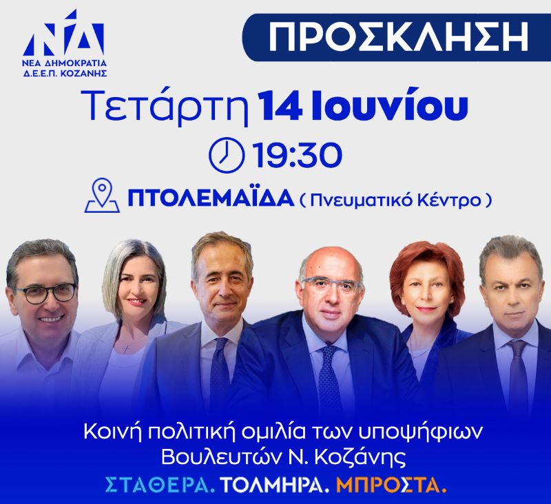Η Δ.Ε.Ε.Π. ΝΔ Π.Ε. Κοζάνης, διοργανώνει προεκλογική εκδήλωση στο Δήμο Εορδαίας, την Τετάρτη 14 Ιουνίου στις 19:30  στο Πνευματικό Κέντρο Πτολεμαΐδας.