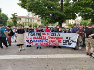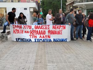 Με πανό που έγραφαν “πόλεμος και φτώχεια στη θάλασσα πνιγμένοι οι μετανάστες είναι της γης οι κολασμενοι”, “τάφοι υγροί, θάλασσες νεκρών κράτη και κεφάλαιο φονιάδες των λαών”, “κάναν τη Μεσόγειο υγρό νεκροταφείο δε θα συνηθίσουμε που εμάς το σφαγείο”, συγκεντρώθηκαν στην πλατεία όπου  προχώρησαν σε ομιλίες οι  Γιώργος Γκούμας πρόεδρος του Σωματείου Ιδιωτικών Υπαλλήλων Ν. Κοζάνης και ο Σπύρος Μωυσιάδης εκ μέρους των Φοιτητικών Συλλόγων.