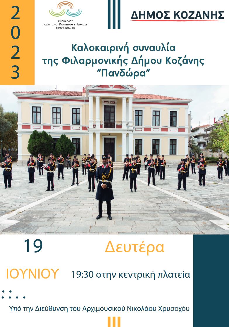 Η προγραμματισμένη για την Κυριακή 18 Ιουνίου ώρα 19:30, καλοκαιρινή συναυλία της Φιλαρμονικής Δήμου Κοζάνης «ΠΑΝΔΩΡΑ», λόγω άστατων καιρικών συνθηκών, αναβάλλεται και θα πραγματοποιηθεί την Δευτέρα 19 Ιουνίου ώρα 19:30 στην Κεντρική πλατεία.