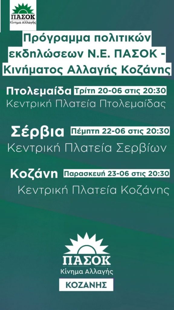 Πολιτικά 20/06/2023 Πρόγραμμα πολιτικών εκδηλώσεων Ν.Ε. ΠΑΣΟΚ – Κινήματος Αλλαγής Κοζάνης 0 Πρόγραμμα πολιτικών εκδηλώσεων Ν.Ε. ΠΑΣΟΚ – Κινήματος Αλλαγής Κοζάνης, σε όλες τις ομιλίες θα είναι παρόν όλοι οι υποψήφιοι βουλευτές της Π.Ε. Κοζάνης.