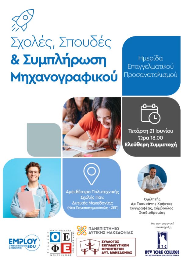 Ο Σύλλογος Εκπαιδευτικών Φροντιστών Δυτικής Μακεδονίας (Σ.Ε.Φ.ΔΥ.Μ.) λαμβάνοντας υπόψη τις σύνθετες διαδικασίες που απαιτεί η συμπλήρωση του μηχανογραφικού δελτίου αλλά και τη σημασία της εύστοχης επιλογής σπουδών και επαγγέλματος, διοργανώνει σε συνεργασία με την πλέον καταρτισμένη και καταξιωμένη επιστημονική ομάδα της EMPLOY EDU Σύμβουλοι Εκπαίδευσης & Σταδιοδρομίας, ένα εξειδικευμένο σεμινάριο Επαγγελματικού Προσανατολισμού με τίτλο «Σχολές, Σπουδές & Συμπλήρωση Μηχανογραφικού», προσανατολισμένο στις ανάγκες των σημερινών μαθητών/τριών και γονέων.