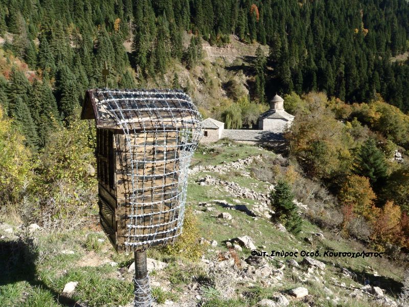 Το εικονοστάσι σχεδιάστηκε  και κατασκευάστηκε  έτσι ,  ώστε να αποφεύγεται η προσέγγιση, η διάρρηξη και η καταστροφή του  από τις καφέ αρκούδες που ζουν στην περιοχή. Πριν μερικά χρόνια ( Απρίλιος 2012 ) στο κοντινό χωριό Χαλίκι  Τρικάλων, αρκούδες είχαν προξενήσει  εκτεταμένες καταστροφές στο  Κοιμητήριο, αναζητώντας ελαιόλαδο στα μνήματα.