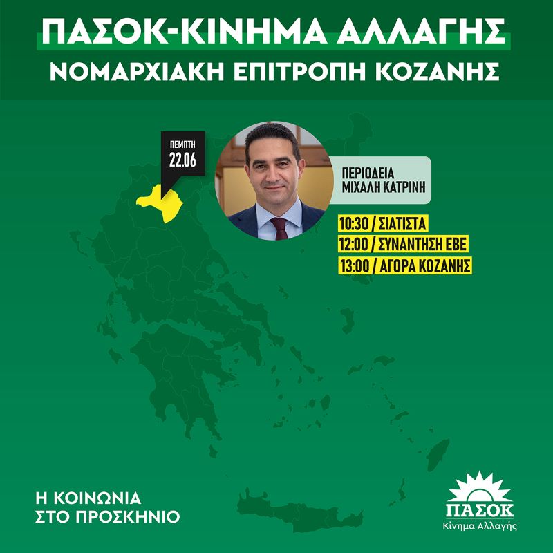 Ν.Ε. ΠΑΣΟΚ – Κινήματος Αλλαγής Κοζάνης: Επίσκεψη Μιχάλη Κατρίνη στην Π.Ε. Κοζάνης την Πέμπτη 22 Ιουνίου