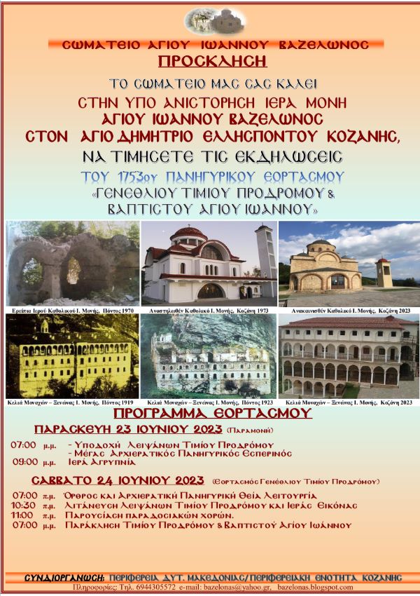 Το πρόγραμμα εκδηλώσεων του πανηγυρικού εορτασμού του «Γενέσιου του Τιμίου Προδρόμου Προφήτου και Βαπτιστού του Χριστού Αγίου Ιωάννου Βαζελώνος»,που θα πραγματοποιηθούν στην υπό ανασύσταση Ιερά Μονή Αγίου Ιωάννου Βαζελώνος, στον Άγιο Δημήτριο Κοζάνης, το διήμερο Παρασκευή και Σάββατο 23 και 24 Ιουνίου 2023.