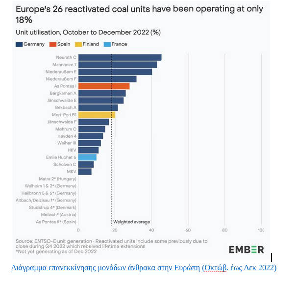 2) Η Ευρώπη ΔΕΝ επιστρέφει στο λιγνίτη. Η αρχική θριαμβολογία των λιγνιτάδων για «επιστροφή στο λιγνίτη» λόγω Ουκρανίας βάλτωσε στην πραγματικότητα. Σε ΟΛΗ την Ευρώπη λόγω της ενεργειακής κρίσης επαναλειτούργησαν μόνο 26 μονάδες άνθρακα κι αυτές με μέσο συντελεστή χρησιμοποίησης πολύ χαμηλό (18%), δηλαδή μία μέρα δούλευαν και τέσσερις καθόταν ! (Τρίμηνο 10/23 έως 12/23)