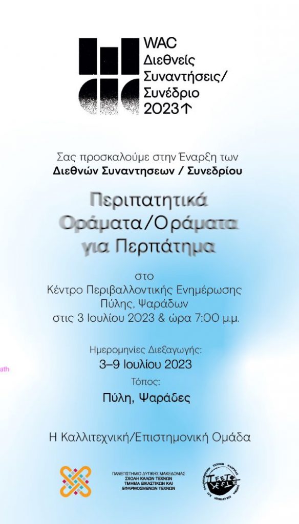Οι Διεθνείς Συναντήσεις/Συνέδριο Περιπατητικά Οράματα/Οράματα για Περπάτημα (Walking Visions/Visions for Walking, WAC 2023) είναι μια διεθνής καλλιτεχνική εκδήλωση που θα πραγματοποιηθεί από τις 3 έως τις 9 Ιουλίου στη συνοριακή περιοχή των Πρεσπών για τρίτη φορά, με τις προηγούμενες το 2019 και το 2021. Οι Διεθνείς Συναντήσεις/Συνέδριο Περιπατητικά Οράματα/Οράματα για Περπάτημα διοργανώνονται από το Τμήμα Εικαστικών και Εφαρμοσμένων Τεχνών της Σχολής Καλών Τεχνών του Πανεπιστημίου Δυτικής Μακεδονίας, Ελλάδα σε συνεργασία με το Made of Walking (VIII) / the Milena principle και το Walk Listen Create.
